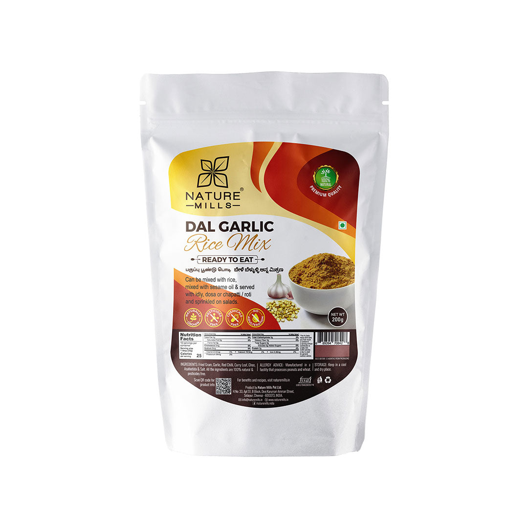 NatureMills Dal Garlic Rice Mix (பூண்டு பருப்பு சாதப் பொடி) is made from authentic homestyle recipe using Dal, garlic and blended with other spices.